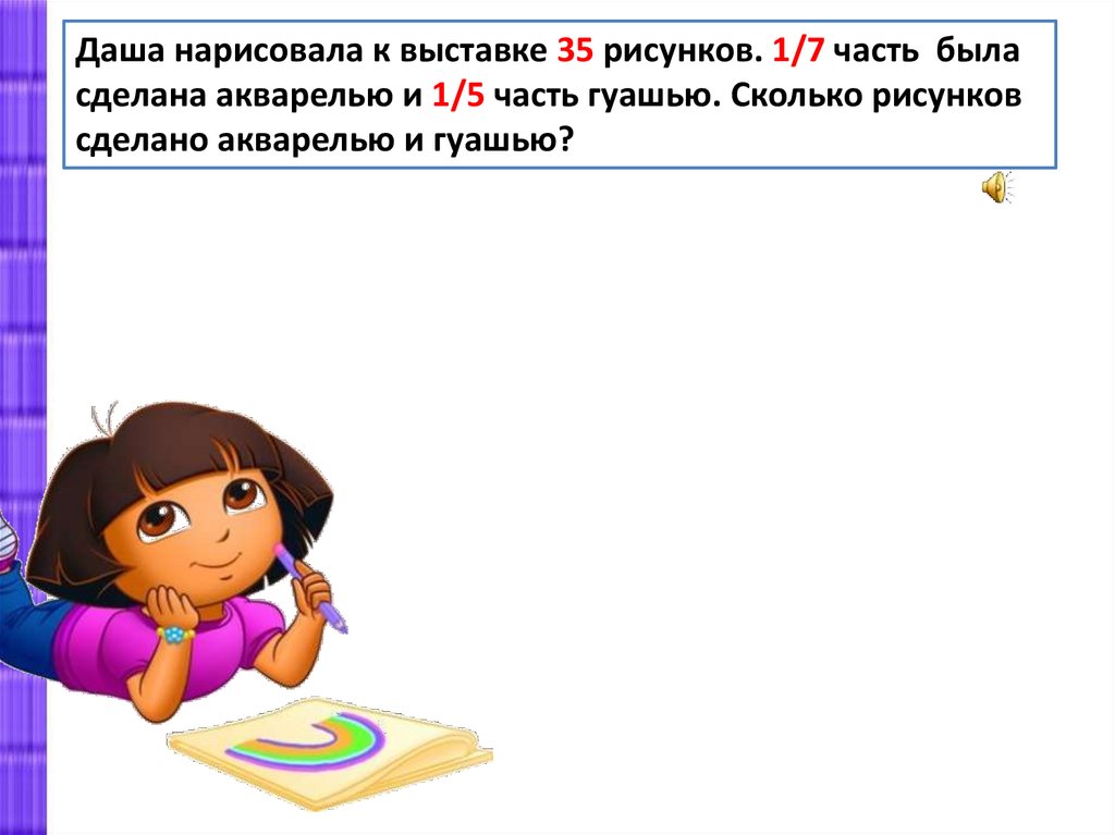 Даша нарисовала к выставке 35 рисунков. 1/7 часть быласделана акварелью и 1/5 часть гуашью. Сколько рисунков