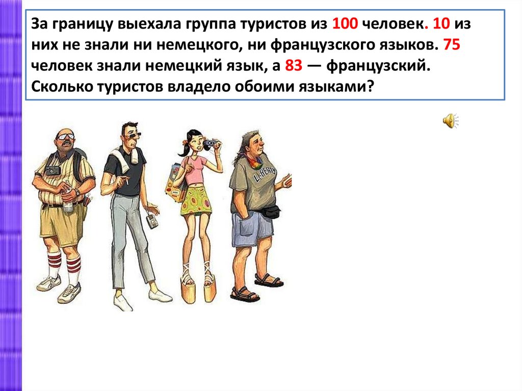 За границу выехала группа туристов из 100 человек. 10 изних не знали ни немецкого, ни французского языков. 75