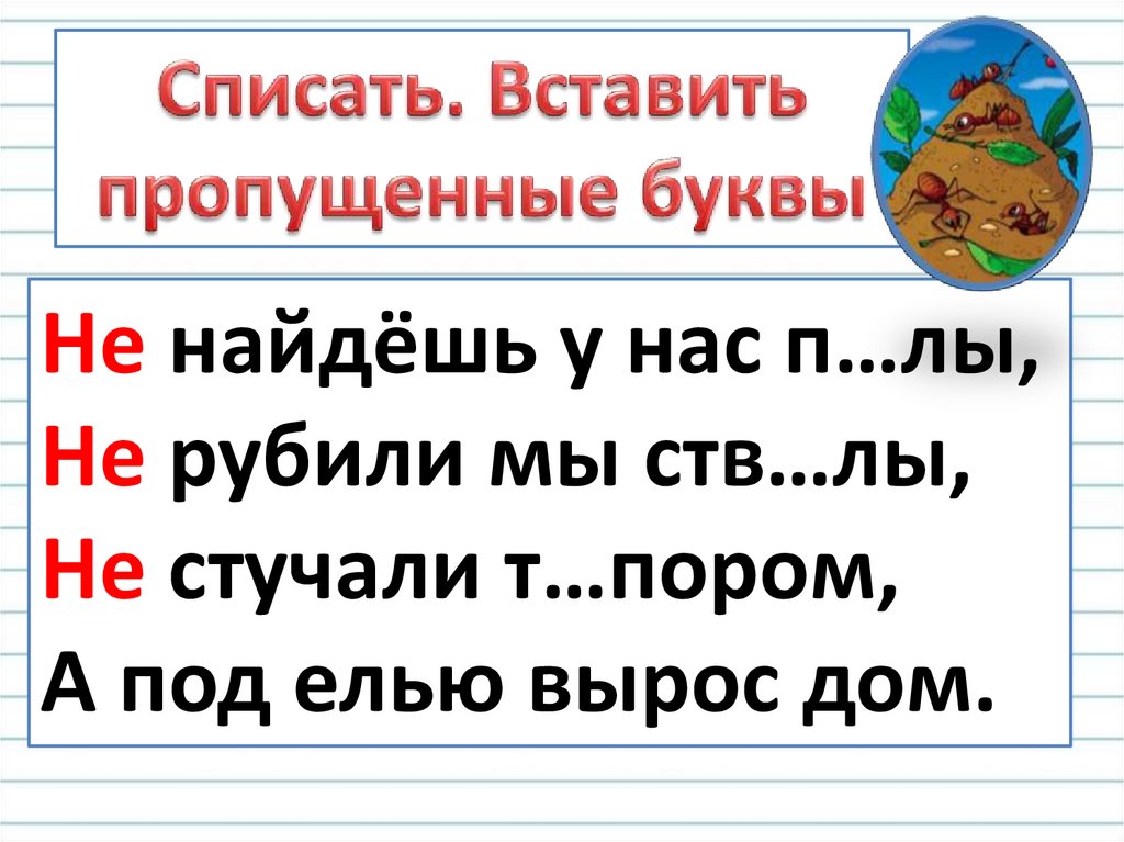 Не найдёшь у нас п…лы,Не рубили мы ств…лы,
