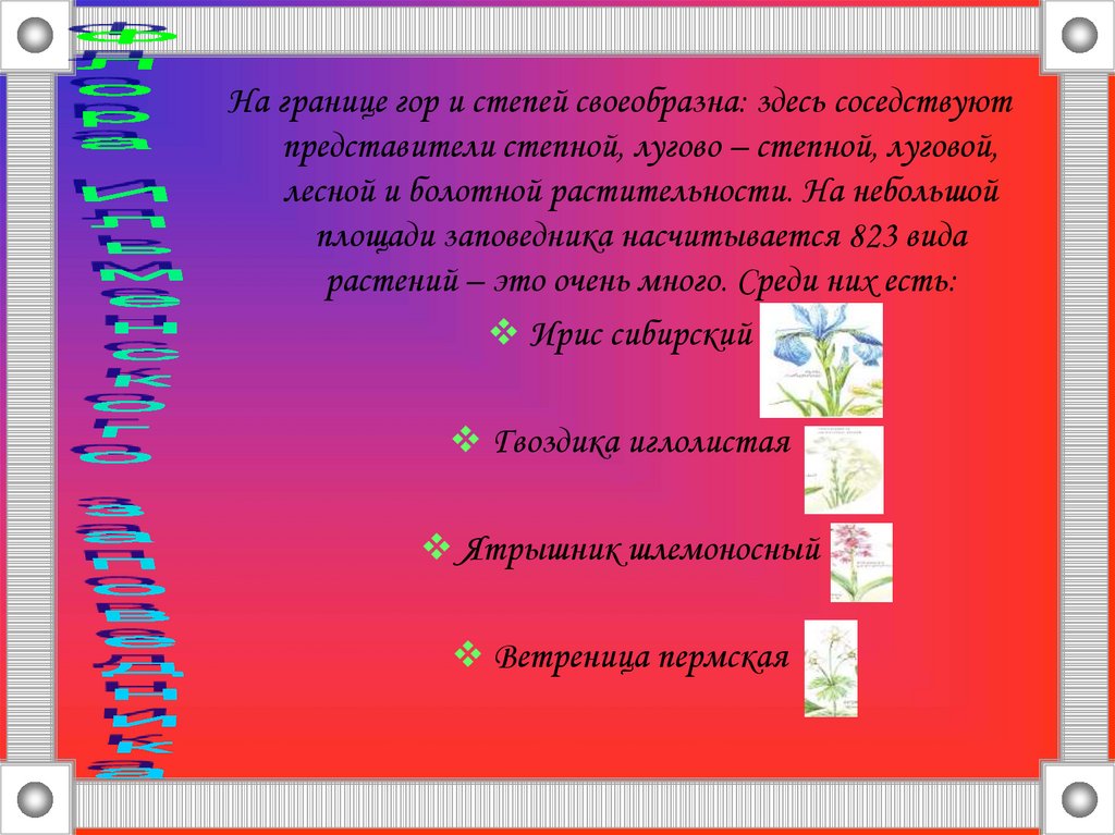 На границе гор и степей своеобразна: здесь соседствуютпредставители степной, лугово – степной, луговой,
