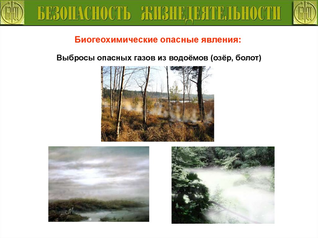 Биогеохимические опасные явления:Выбросы опасных газов из водоёмов (озёр, болот)