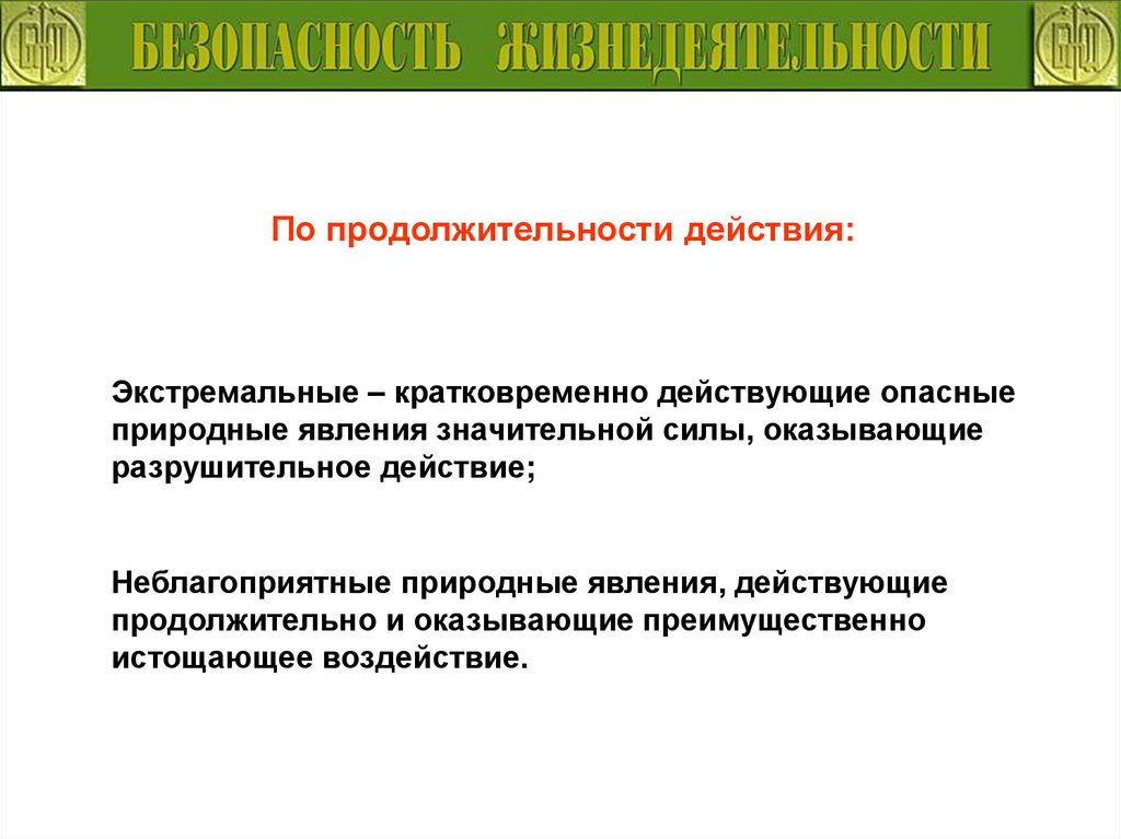 По продолжительности действия:Экстремальные – кратковременно действующие опасные