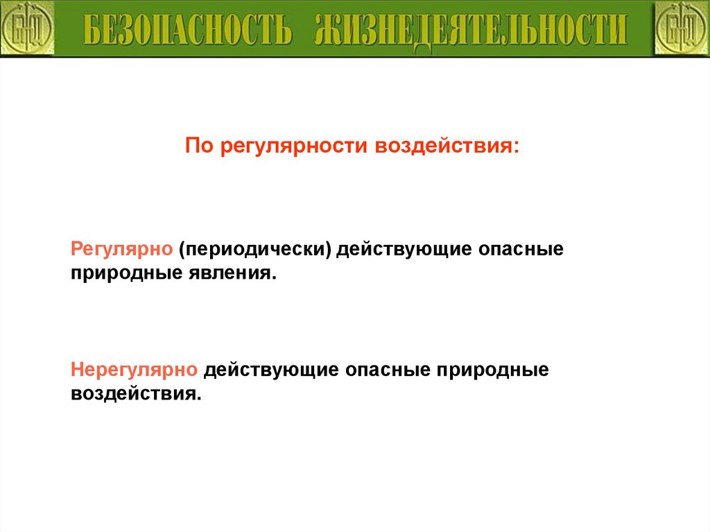 По регулярности воздействия:Регулярно (периодически) действующие опасные