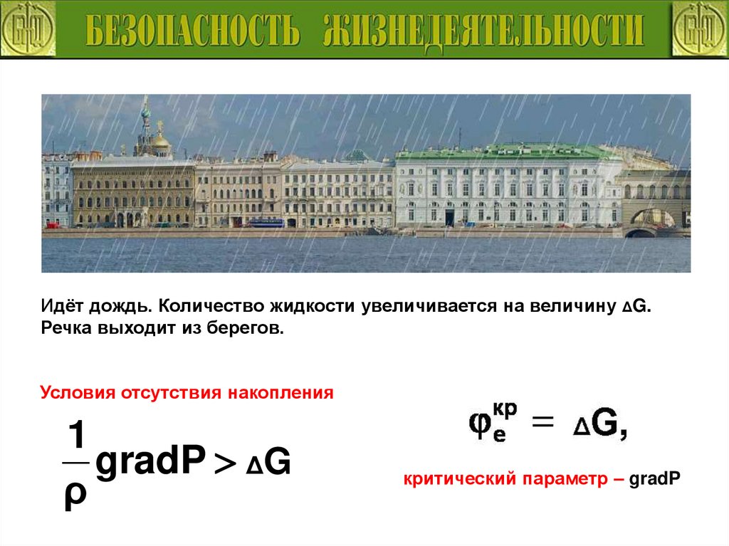 Идёт дождь. Количество жидкости увеличивается на величину ΔG.Речка выходит из берегов.