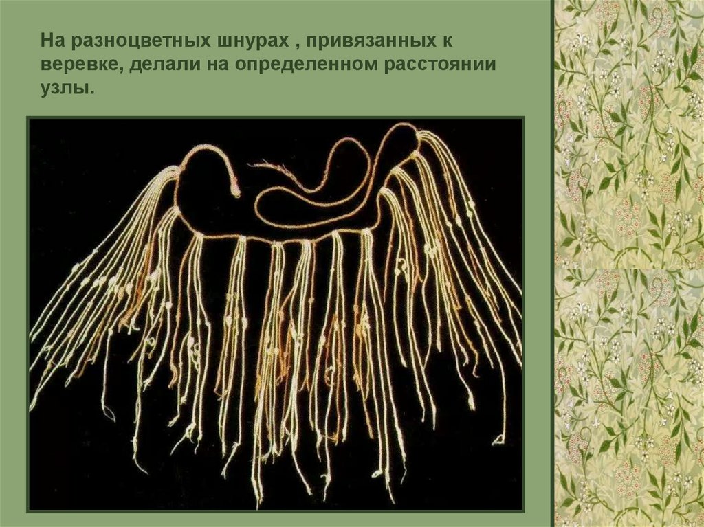 На разноцветных шнурах , привязанных кверевке, делали на определенном расстоянии