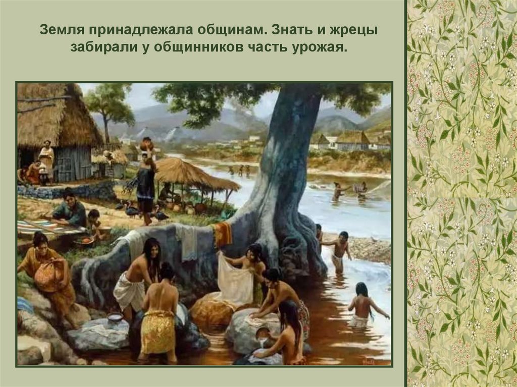 Земля принадлежала общинам. Знать и жрецызабирали у общинников часть урожая.