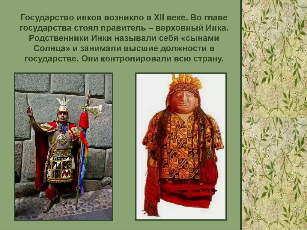 Государство инков возникло в XII веке. Во главегосударства стоял правитель – верховный Инка.