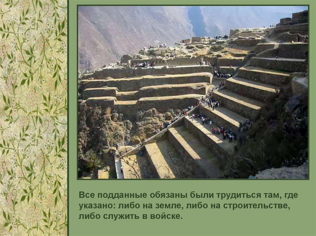 Все подданные обязаны были трудиться там, гдеуказано: либо на земле, либо на строительстве,