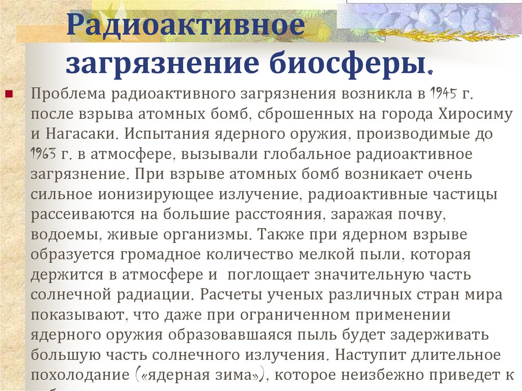 Проблема радиоактивного загрязнения возникла в 1945 г.после взрыва атомных бомб, сброшенных на города Хиросиму