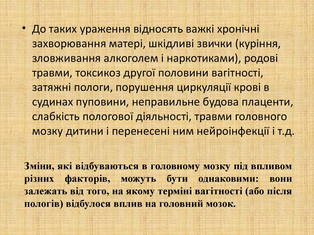 • До таких ураження відносять важкі хронічнізахворювання матері, шкідливі звички (куріння,
