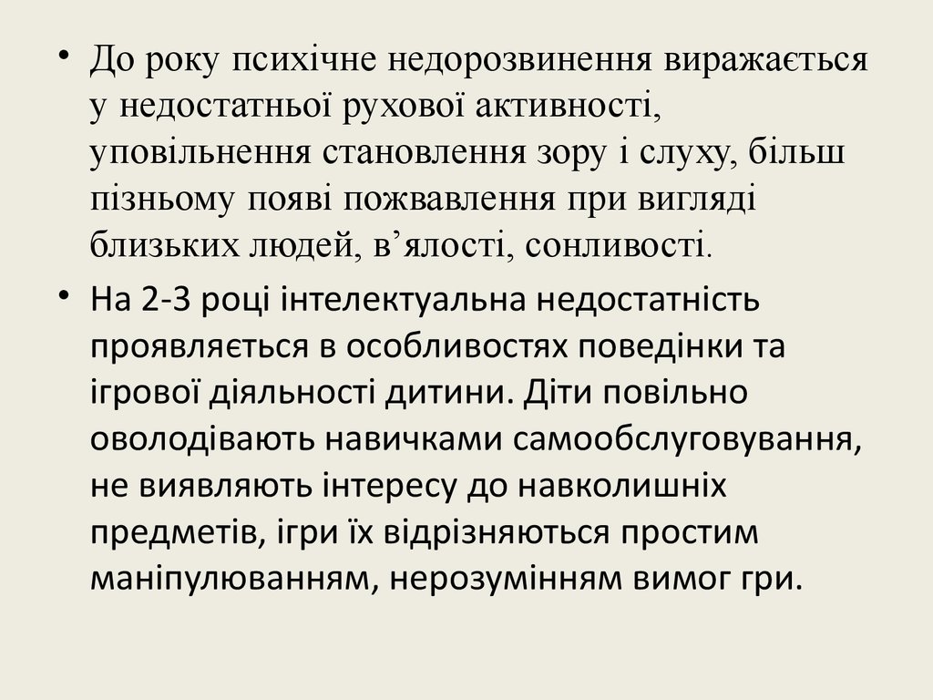 • До року психічне недорозвинення виражаєтьсяу недостатньої рухової активності,
