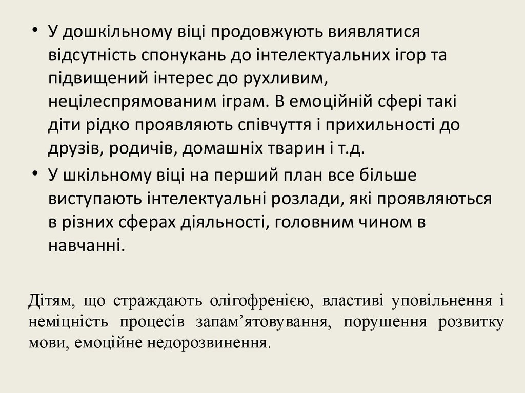 • недорозвинення при олігофренії маєтотальний характер і стосується не тільки