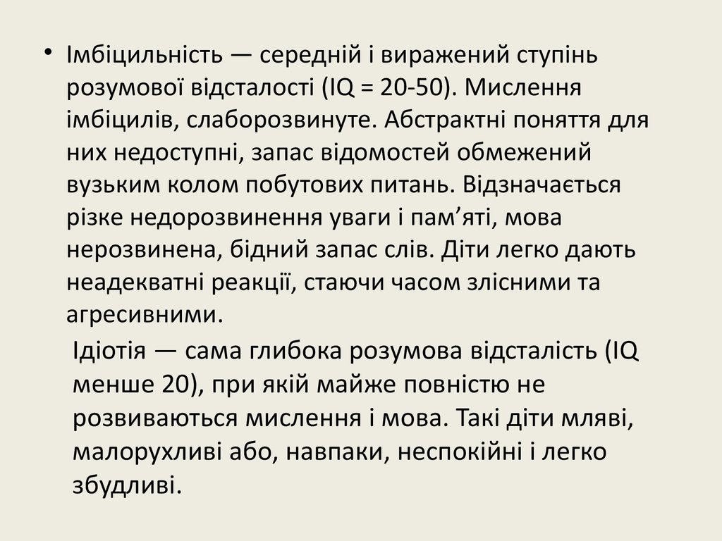 • Імбіцильність — середній і виражений ступіньрозумової відсталості (IQ = 20-50). Мислення