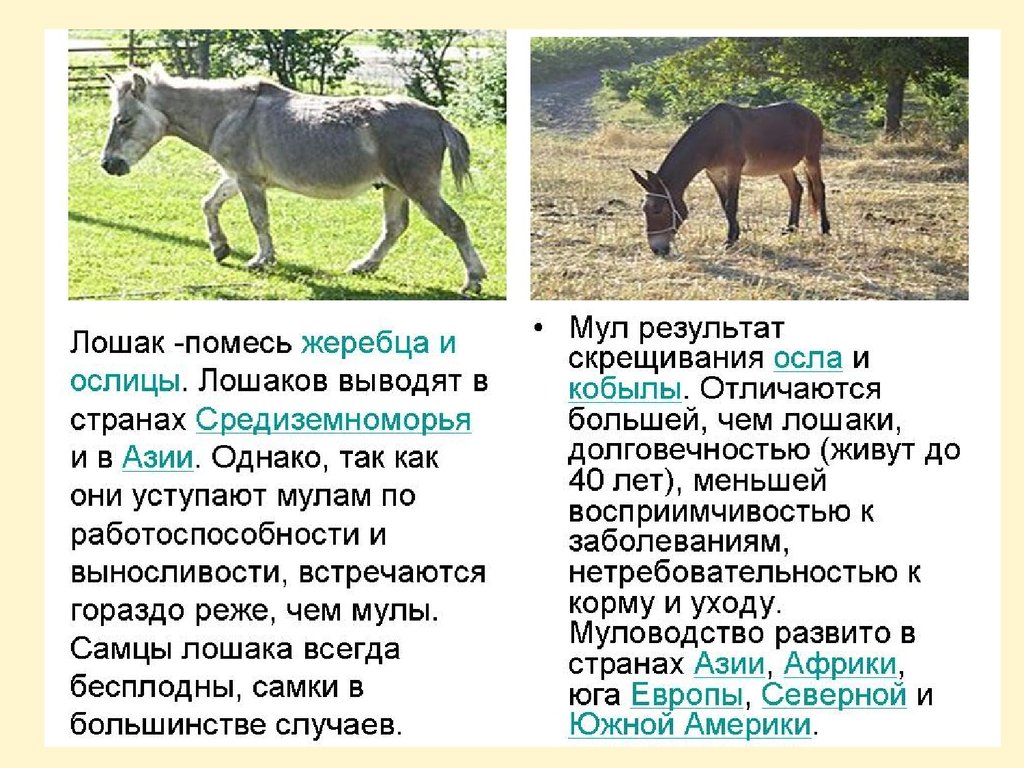 Лошадь + осел = мул У лошака (ослица +жеребец) гетерозис практически отсутствует