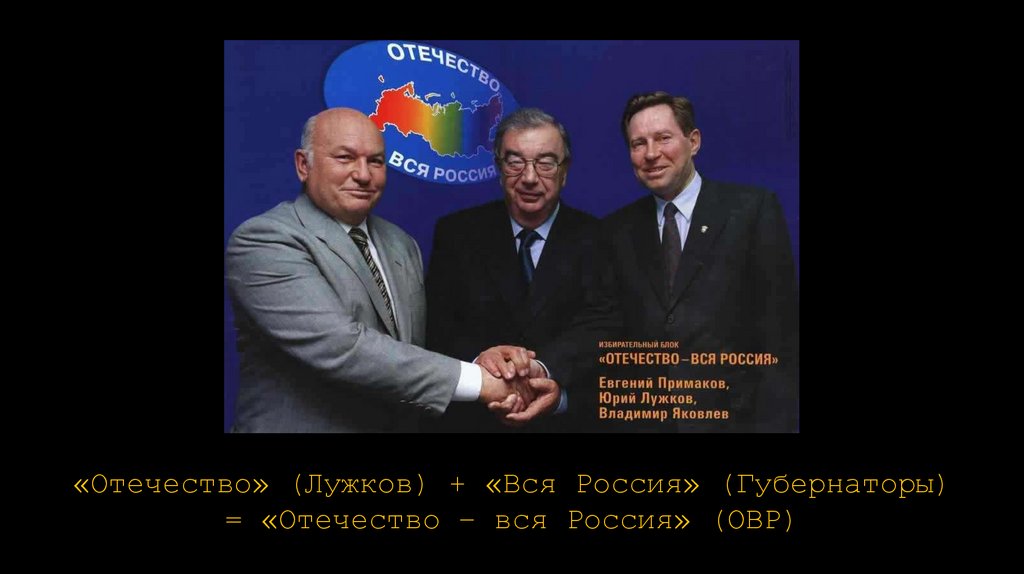 «Отечество» (Лужков) + «Вся Россия» (Губернаторы)= «Отечество – вся Россия» (ОВР)