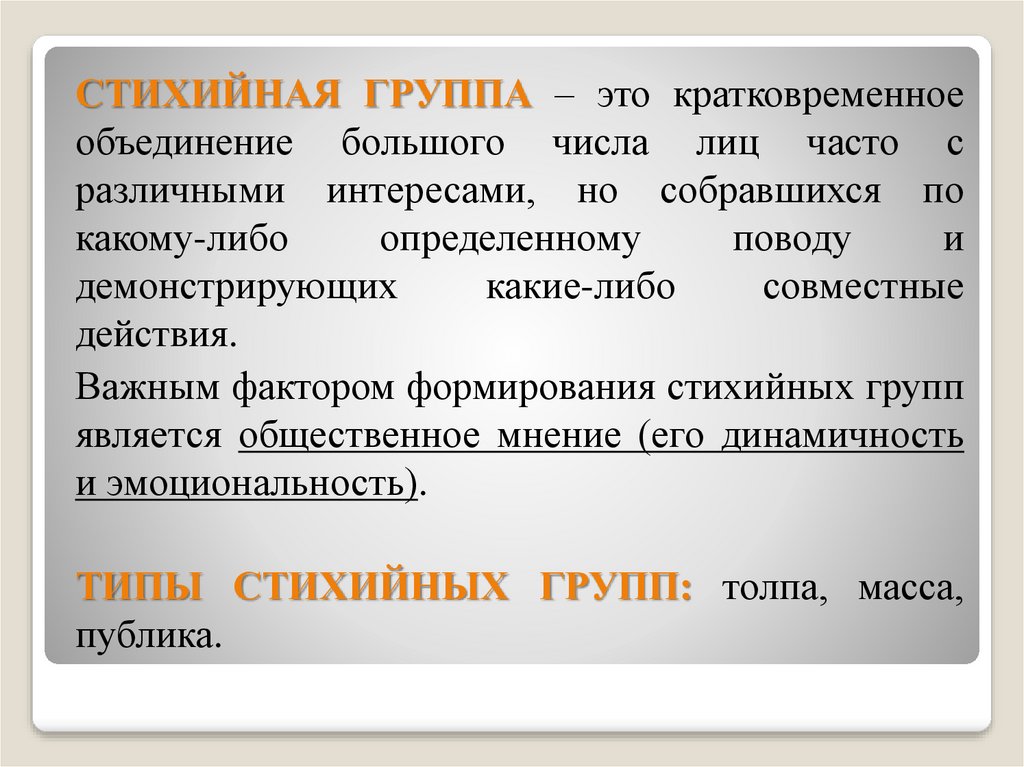 СТИХИЙНАЯ ГРУППА – это кратковременноеобъединение большого числа лиц часто с