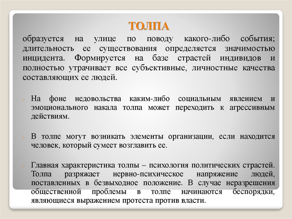 1. Однородность (толпа уравнивает всех людей, индивидуальная манера поведения