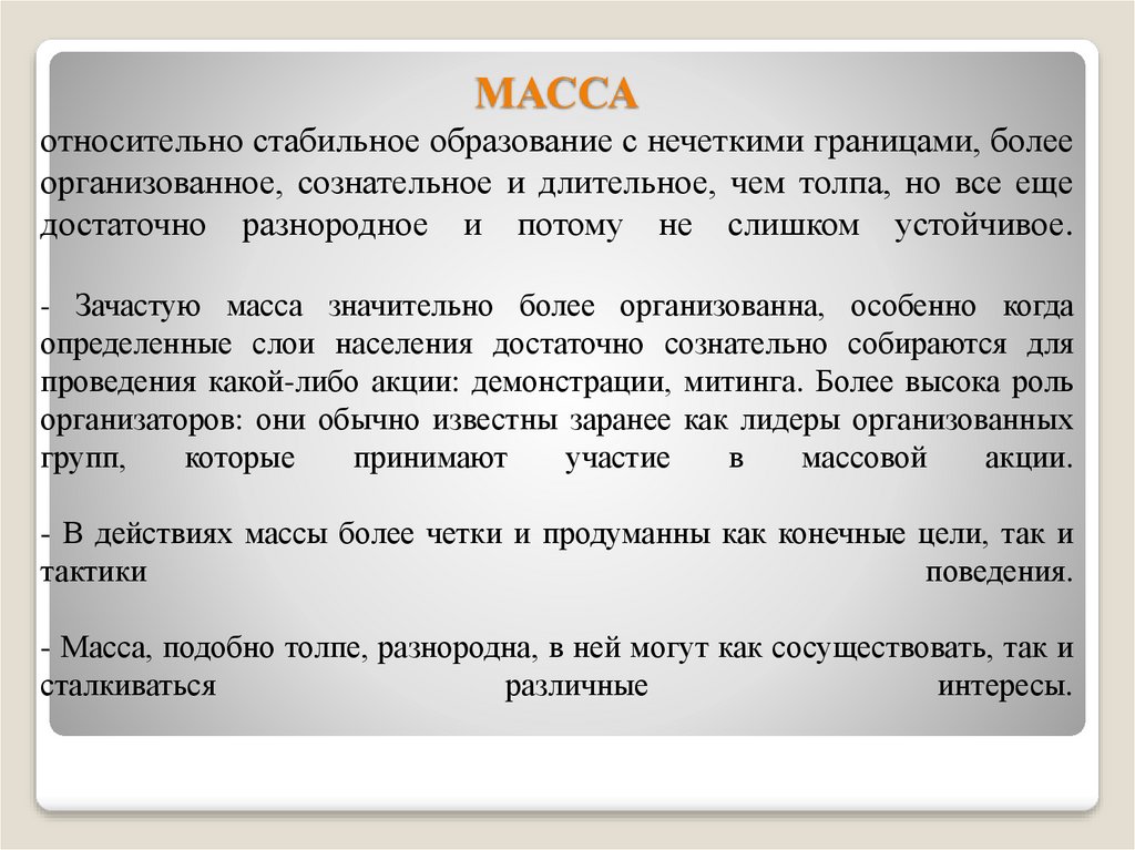 - Масса, подобно толпе, разнородна, в ней могут как сосуществовать, так и