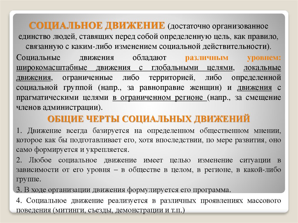 СОЦИАЛЬНОЕ ДВИЖЕНИЕ (достаточно организованноеединство людей, ставящих перед собой определенную цель, как правило,