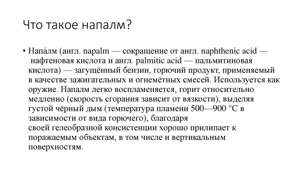 Что такое напалм?• Напа́лм (англ. napalm — сокращение от англ. naphthenic acid —