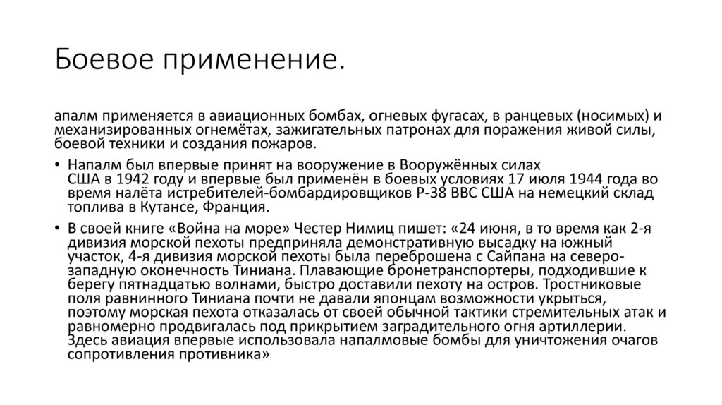 Боевое применение.апалм применяется в авиационных бомбах, огневых фугасах, в ранцевых (носимых) и