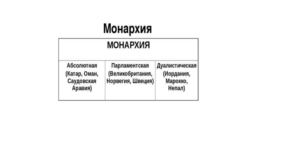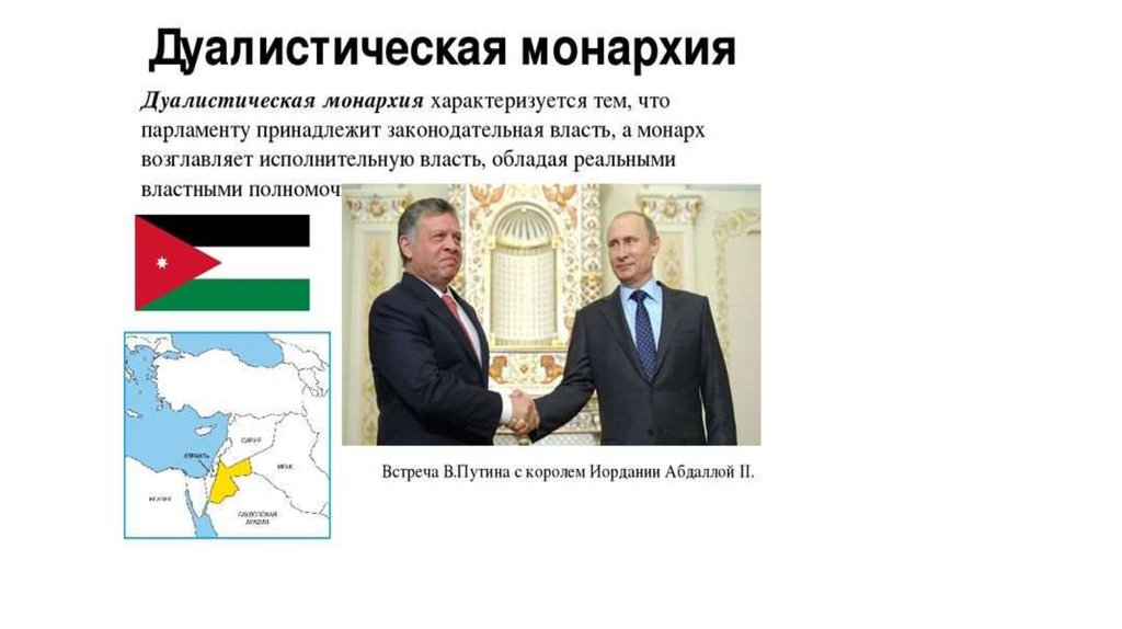 - дуалистическая (Иордания, законодательная власть разделена между парламентом и монархом)