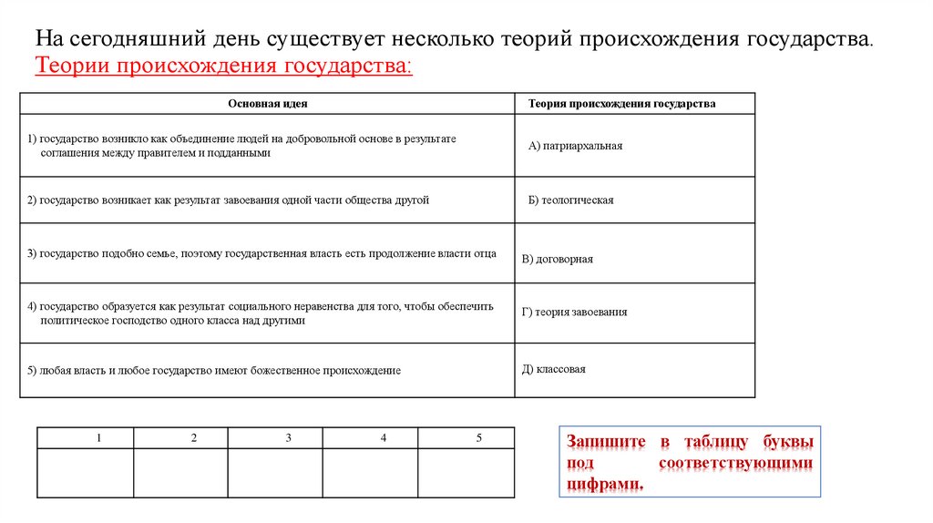 На сегодняшний день существует несколько теорий происхождения государства.Теории происхождения государства: