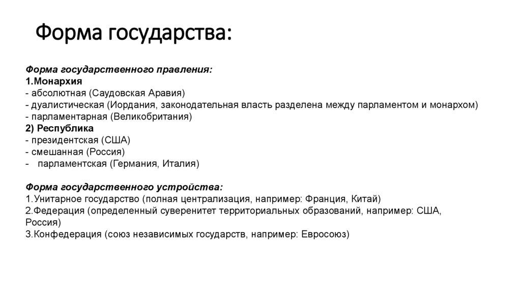 1.Унитарное государство (полная централизация, например: Франция, Китай)