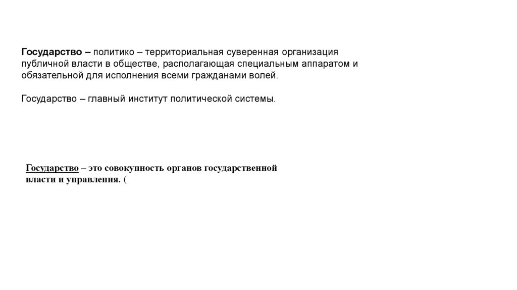 Государство – политико – территориальная суверенная организацияпубличной власти в обществе, располагающая специальным аппаратом и