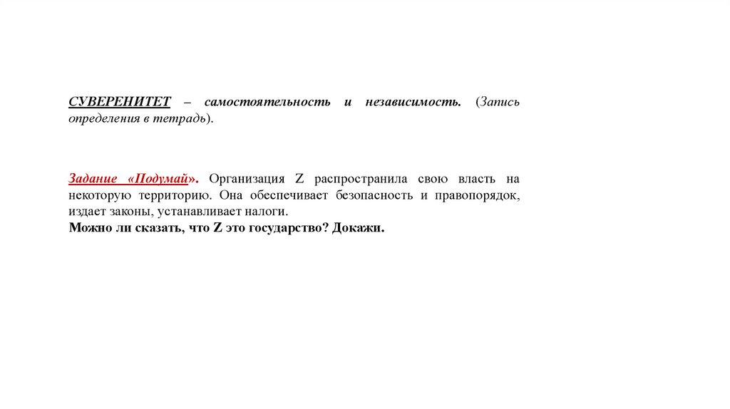 СУВЕРЕНИТЕТ – самостоятельность и независимость. (Записьопределения в тетрадь).