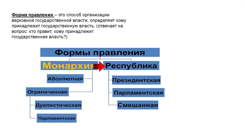 Форма правления – это способ организацииверховной государственной власти, определяет кому