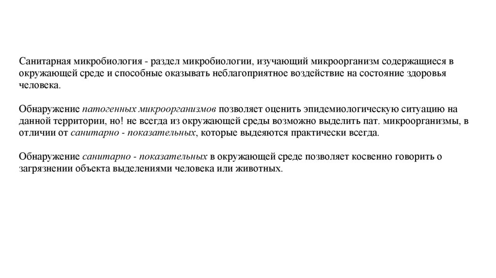 Санитарная микробиология - раздел микробиологии, изучающий микроорганизм содержащиеся вокружающей среде и способные оказывать неблагоприятное воздействие на состояние здоровья
