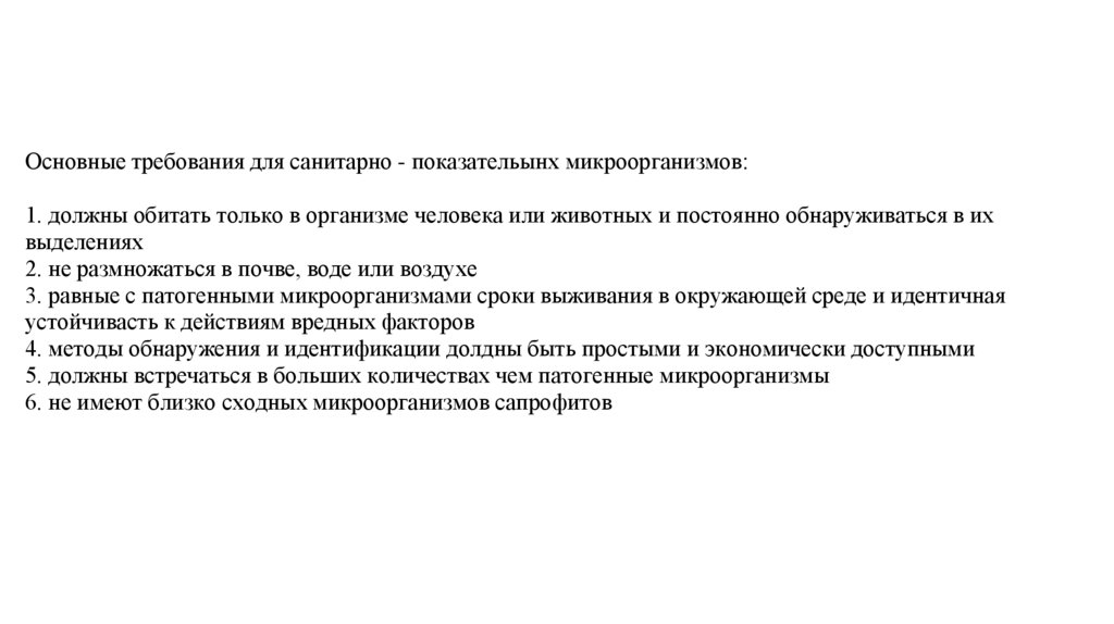 Основные требования для санитарно - показательынх микроорганизмов:1. должны обитать только в организме человека или животных и постоянно обнаруживаться в их