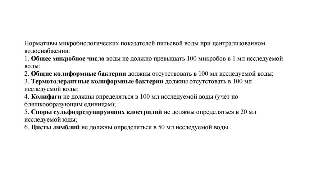 Нормативы микробиологических показателей питьевой воды при централизованномводоснабжении: