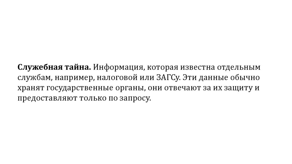Служебная тайна. Информация, которая известна отдельнымслужбам, например, налоговой или ЗАГСу. Эти данные обычно