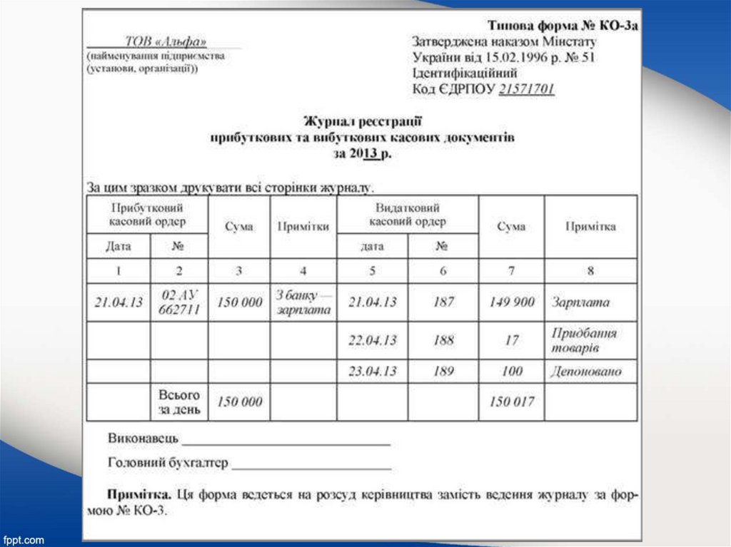1. Pеєстрація прибуткових і видаткових касових ордерів у журналі