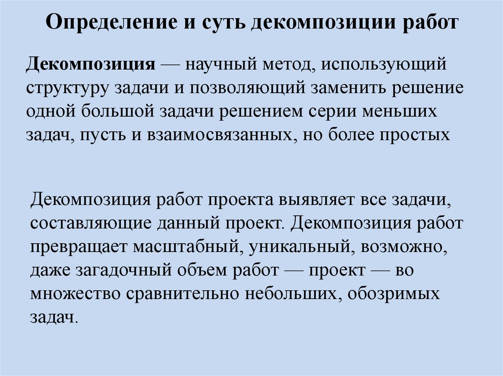Определение и суть декомпозиции работДекомпозиция — научный метод, использующий