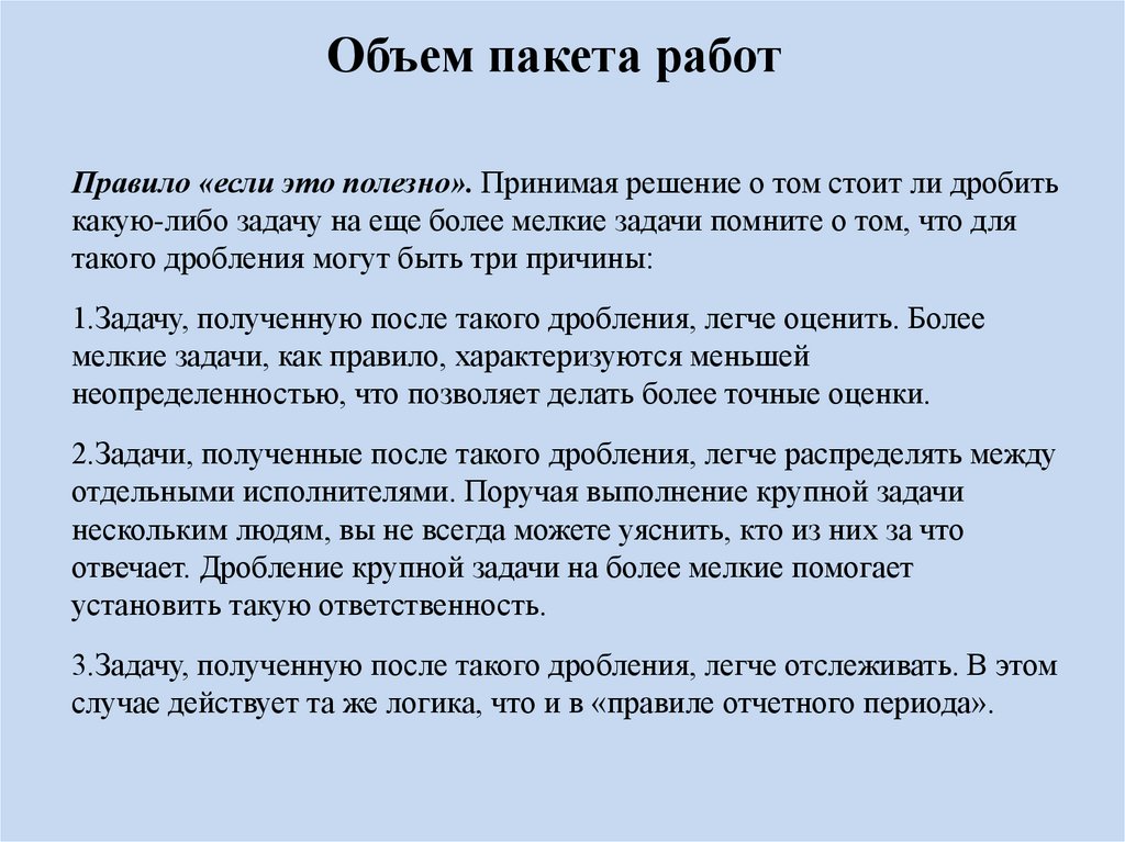 Объем пакета работПравило «если это полезно». Принимая решение о том стоит ли дробить