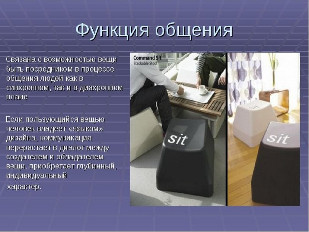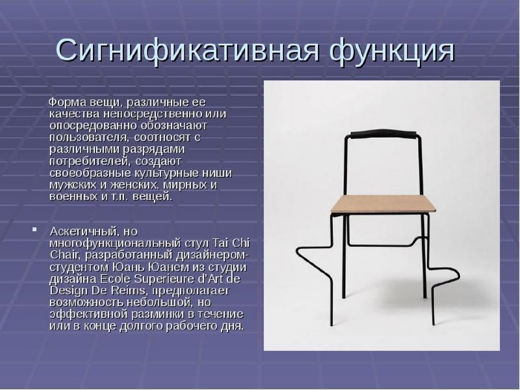 Функция вещи - это назначение вещи.Казалось бы, стул нужен для того, чтобы сидеть.