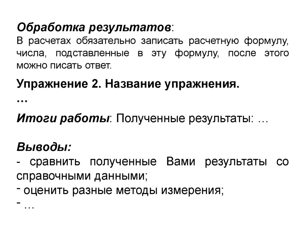 Обработка результатов:В расчетах обязательно записать расчетную формулу,