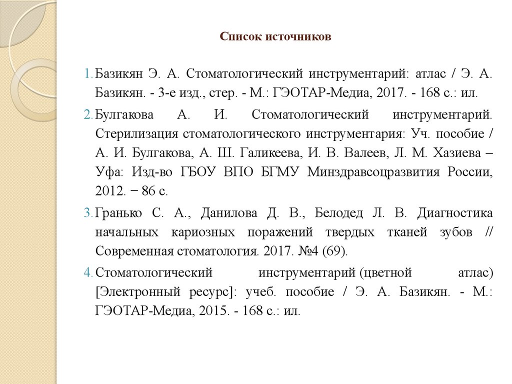 Список источников1.Базикян Э. А. Стоматологический инструментарий: атлас / Э. А.