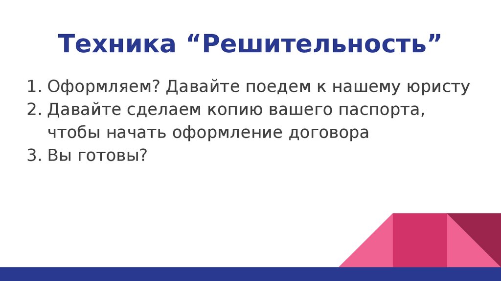 Техника “Решительность”1. Оформляем? Давайте поедем к нашему юристу