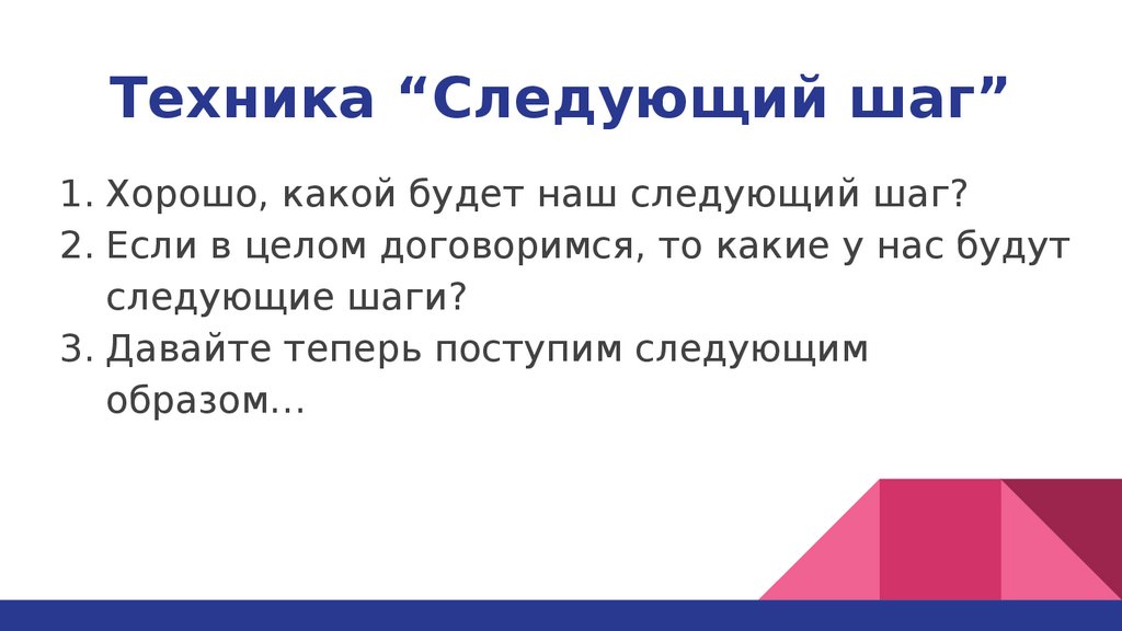 Техника “Следующий шаг”1. Хорошо, какой будет наш следующий шаг?