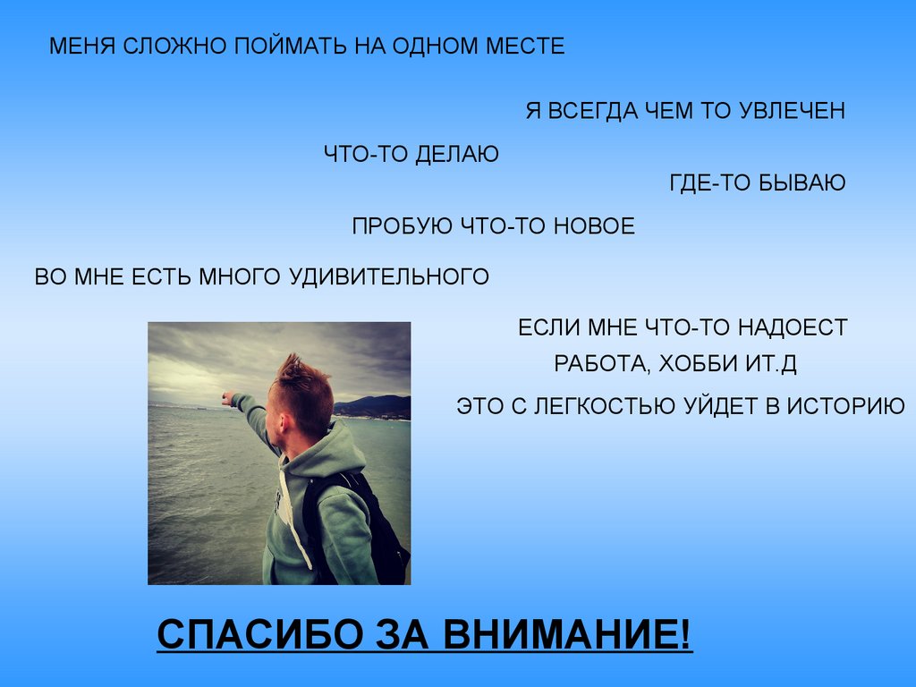 МЕНЯ СЛОЖНО ПОЙМАТЬ НА ОДНОМ МЕСТЕЯ ВСЕГДА ЧЕМ ТО УВЛЕЧЕН