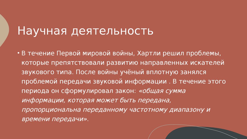 Научная деятельность• В течение Первой мировой войны, Хартли решил проблемы,