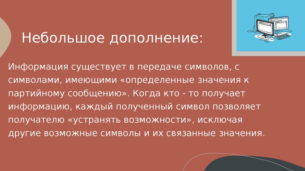 Небольшое дополнение:Информация существует в передаче символов, с