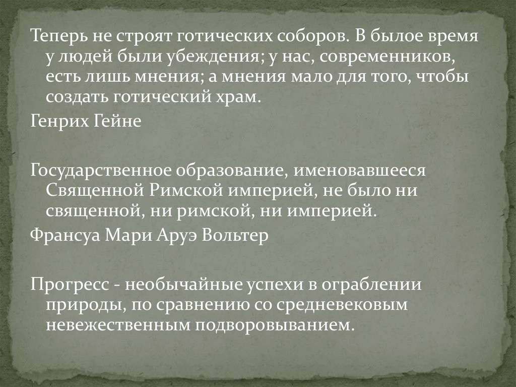 Теперь не строят готических соборов. В былое времяу людей были убеждения; у нас, современников,