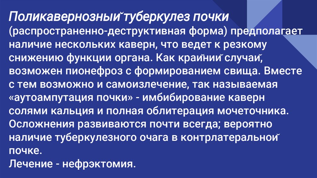 Поликавернозный туберкулез почки(распространенно-деструктивная форма) предполагает