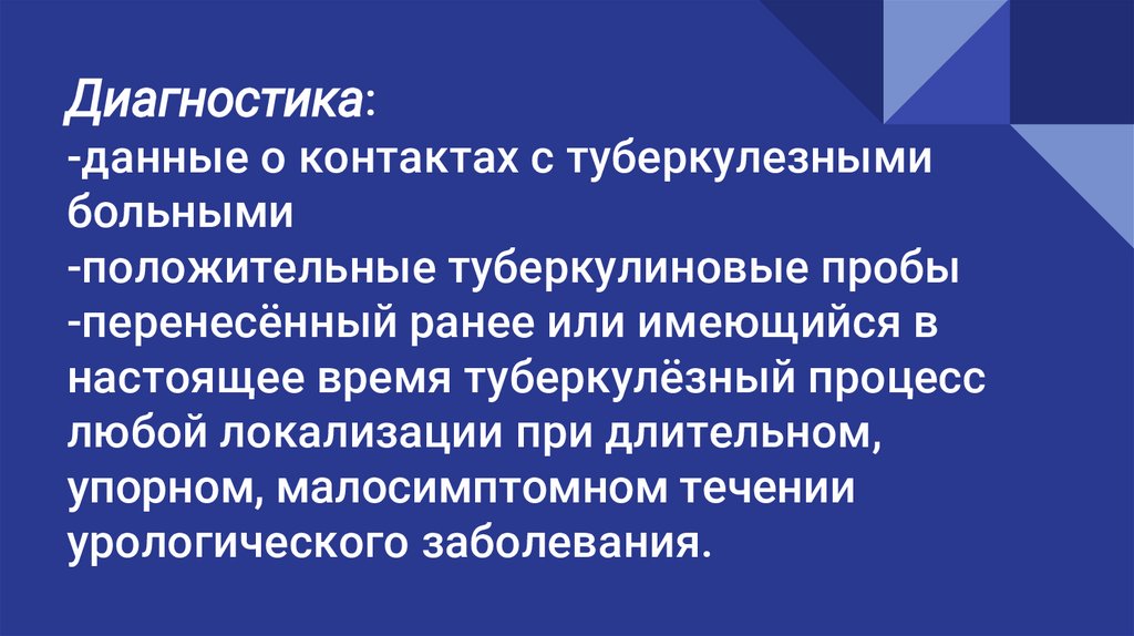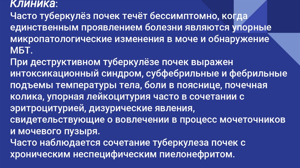 Клиника:Часто туберкулёз почек течёт бессимптомно, когда