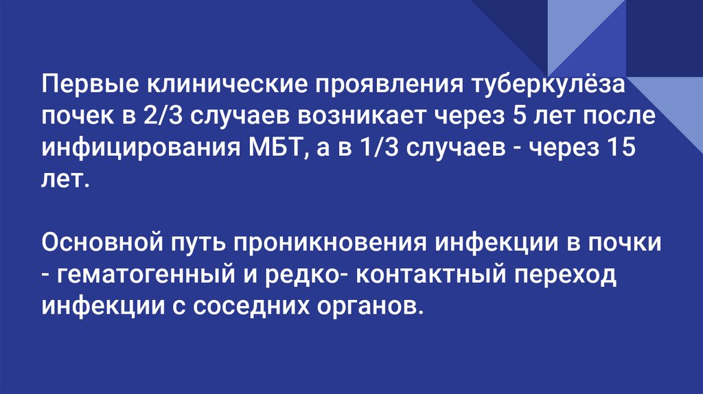 Первые клинические проявления туберкулёзапочек в 2/3 случаев возникает через 5 лет после